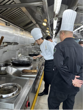 泰国Phanuphong Sawathat老师被深深吸引,虽首次接触中式炒锅却毫不畏惧。在麦师傅耐心指导下,Phanuphong Sawathat老师专注学习握锅、翻炒与火候掌控。他虽动作生涩但认真执着,从小心下锅到努力翻炒均匀,逐步领悟粤菜烹饪奥秘,其积极参与为课堂注入活力。